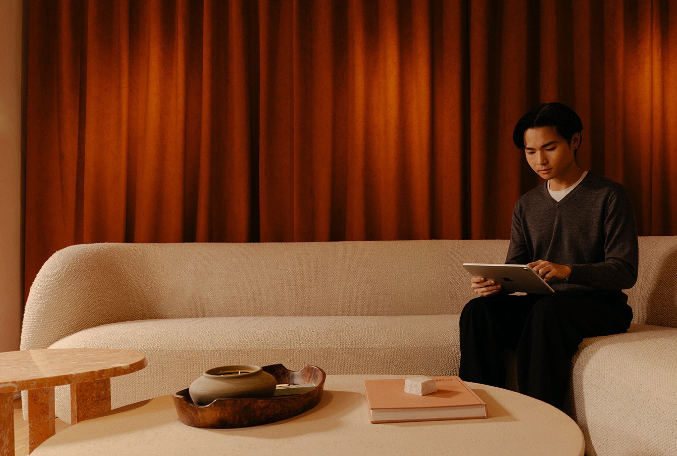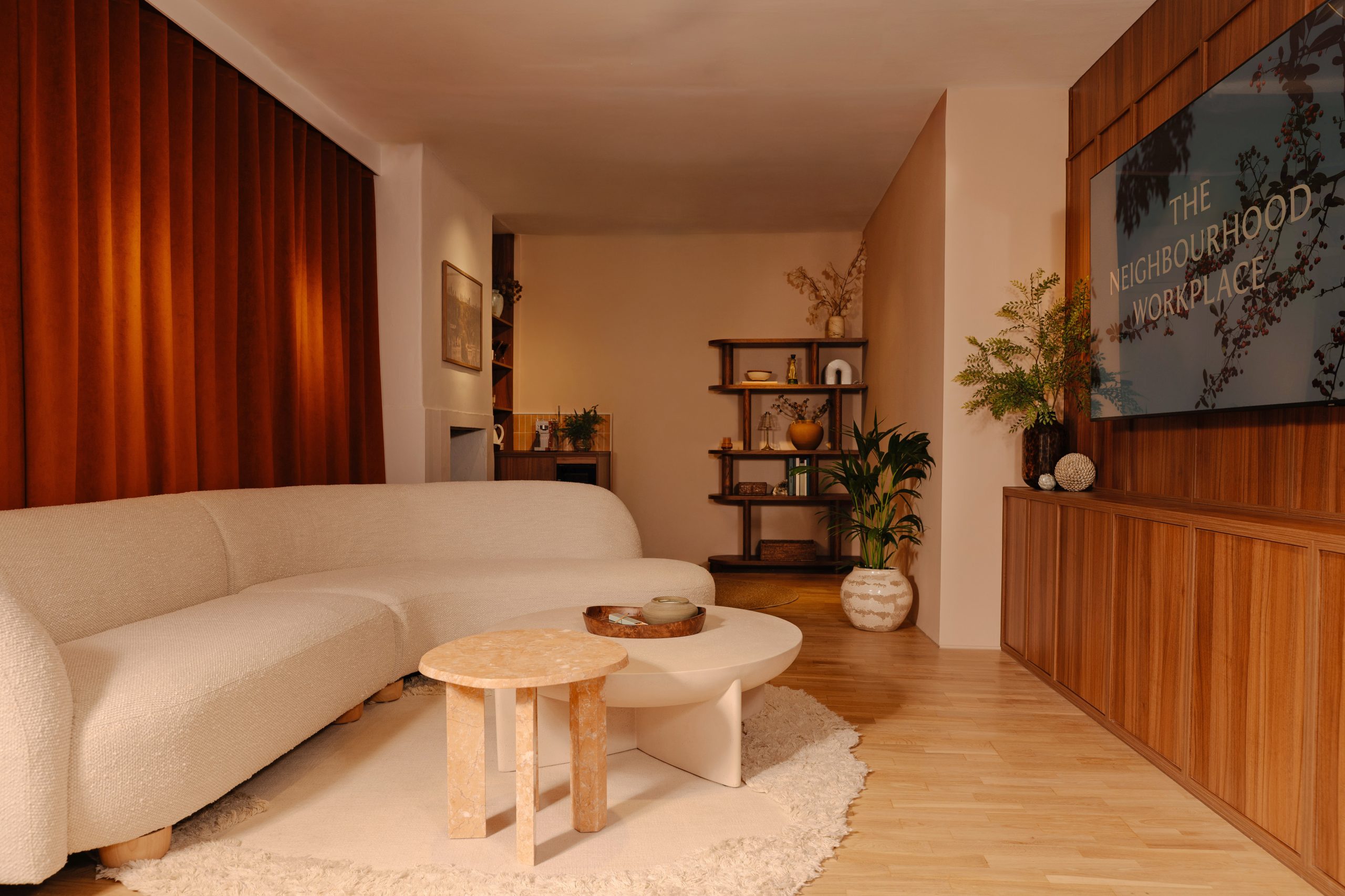Right across from the site, we transformed an empty boutique shop into a welcoming gallery space. We worked with Gemco to design a space that draws on the natural materials of Notting Hill Place. Wood panelling, draped curtains and bespoke joinery create a relaxed and impactful experience.